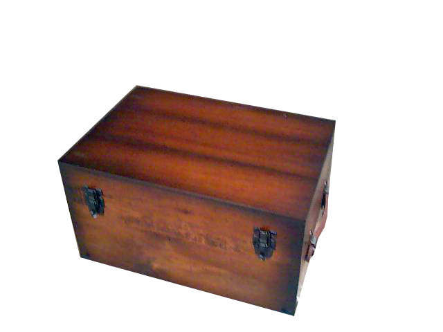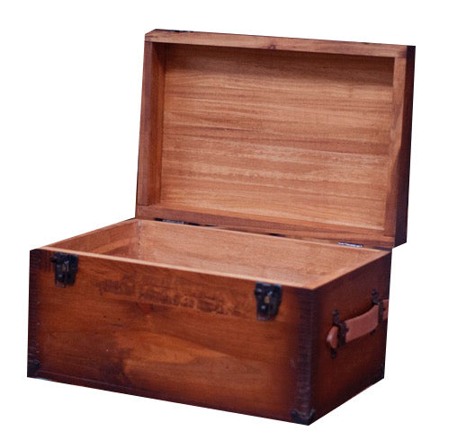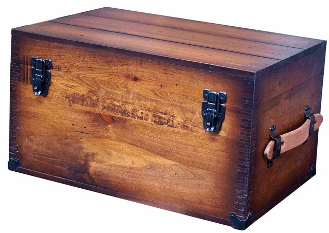 Hand crafted custom wooden military keepsake box. This keepsake box is individually crafted from pine and is stained, distressed, hand-sanded, shaded and lacquered for durability. Features a hinged top, and lockable front clasps. The U.S. Air Force, U. S. Coast Guard, or U. S. Marine is printed on the front. Includes a removable tray. The ends are haunched to provide beauty and strength and feature leather strap handles. Measures 17.75" x 12" x 9.75". Made in the U.S.A.